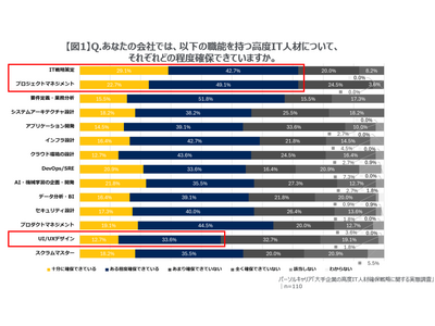 高度IT人材を14の職能に分類し、それぞれどの程度確保できているかを聞いたところ、「十分に確保できている」と「ある程度確保できている」の回答合計が最も多かったのは、「IT戦略策定」、「プロジェクトマネジメント」でそれぞれ71.8%でした。「要件定義・業務分析」も67.3%で続きます。一方、「UI/UXデザイン」は最も少ない46.3%で半数を切りました【図1】。