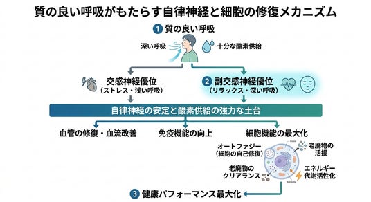 呼吸は、私たちが自律神経を意識的にコントロールできる唯一の手段です。「質の良い呼吸=深い呼吸」によって十分な酸素を取り込むと、副交感神経が優位になり、血管の修復や免疫機能の向上が促されます。この「質の良い呼吸による自律神経の安定と酸素供給」という強力な土台があって初めて、オートファジーのような細胞の自己修復機能や老廃物のクリアランス機能が正常に稼働し、健康のパフォーマンスが最大化されます。