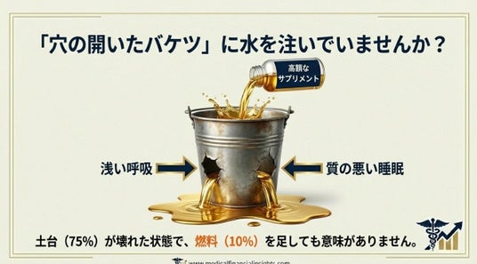 「これを飲めば健康になる」とメディアで煽られる単品の食材やサプリメントが健康全体に占める割合は、全体の「食(10%)」の中のさらに数パーセント、つまり全体から見れば1%にも満たない極小のピースに過ぎません。呼吸(酸素供給)や睡眠という土台が崩れた状態で、特定の食材(燃料)を摂る「足し算」の健康法は、まさに「穴の開いたバケツに高級な水を注ぐようなもの」です。呼吸が浅く酸欠状態であれば、どれほど良い燃料も細胞内(ミトコンドリア)でエネルギーに変換できず不完全燃焼を起こし、老廃物(ゴミ)が溜まるだけです。まずはバケツの穴