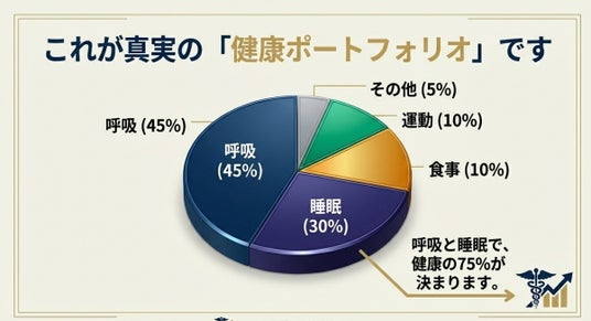 1. 呼吸(24時間の酸素供給・代謝の根幹):45%2. 睡眠(脳・組織の修復と自律神経の回復):30% 3. 食・栄養(燃料の補給:特定食材の影響は極小):10% 4. 運動(身体機能の調整とブースト):10% 5. その他(メンタル・社会的要因など):5%