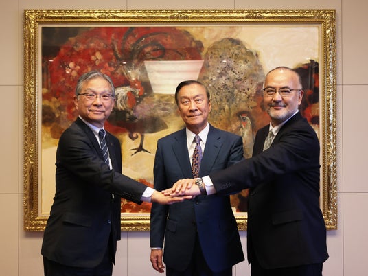 (写真左から)竹中工務店社長 佐々木正人、学校法人明治大学理事長 柳谷孝、明治大学学長 上野正雄