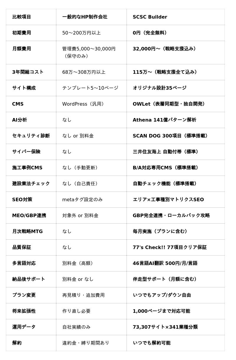建設業の経営者が最も知りたいこと。それは「結局、何が違うのか」です。以下に、一般的なHP制作との比較を包み隠さずお見せします。