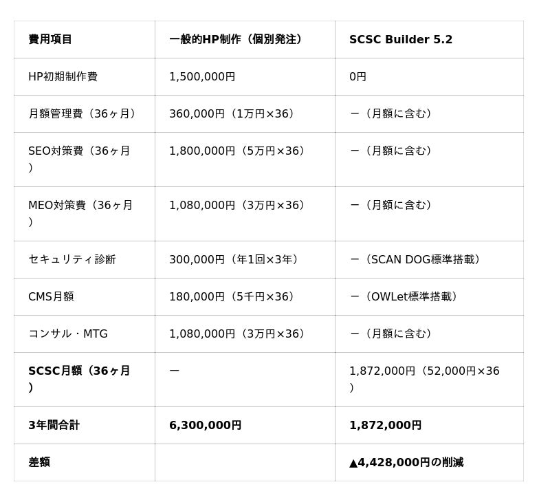 「安いから選ぶ」のではありません。「圧倒的に多くのものが含まれているから、結果的にコストパフォーマンスが桁違いになる」── それがSCSC Builderの費用構造です。