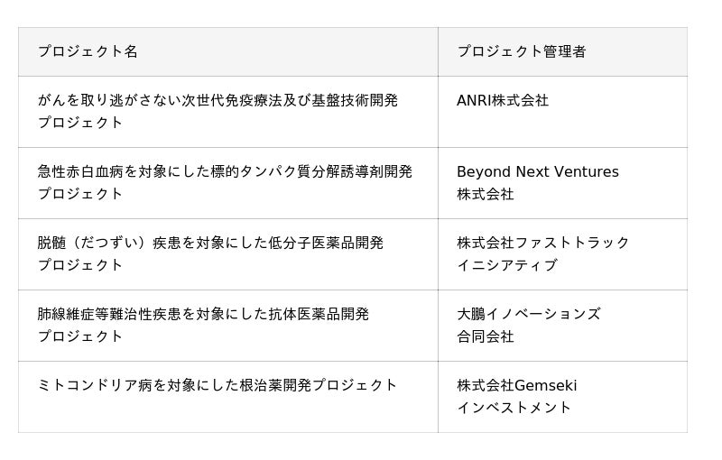 カンパニークリエーションは、ベンチャーキャピタル(VC)等が有望な研究シーズに狙いを定めスタートアップを立ち上げる手法です。創薬分野は、開発の成功確率を向上させるため、事前に研究内容等を十分検証することが重要であり、本手法の活用が有効な分野と考えられています。今回選定したプロジェクトでは、いずれも難治性疾患を対象としており、新たな治療薬が求められるなど、医療ニーズが高い分野に取り組むものです。