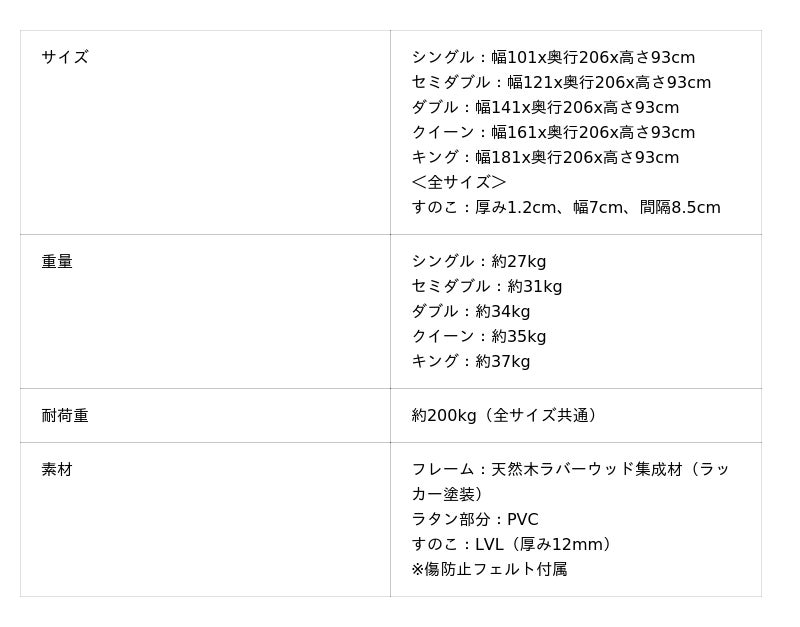 フレームには天然木ラバーウッドを使用しており、寝室をぬくもりのある空間に仕上げることができます。また通気性抜群のすのこを採用しているので、梅雨のジメジメや寝汗で湿気が溜まりがちな寝床内も通気性の高いすのこを採用することにより年中快適に眠ることが可能です。