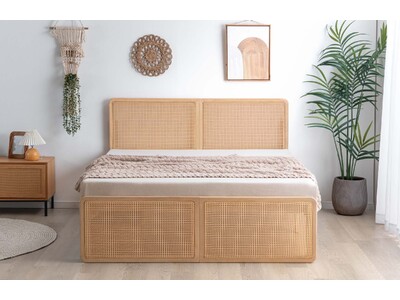 ヘッドボードとフットボードにラタン調デザインを採用しており、ラタンならではの美しい編み目を贅沢に楽しめるベッドフレームとなっています。自然な風合いでお部屋に馴染みながらも、編み目が作る立体感が寝室にほどよいアクセントを与えてくれます。