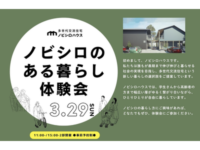 場を仕掛ける社会実験推進ベンチャー・株式会社BAKERU(本社:東京都港区、代表取締役:小林肇)の子会社である株式会社ノビシロ(本社:神奈川県藤沢市、代表取締役CEO:鮎川沙代)は、ノビシロハウス2号棟予定地の東京都久留米市で、2026年3月29日(日)、「ノビシロのある暮らし体験会」を開催します。本イベントは、入居希望者だけではなく、街づくりの一環として地域の人々にも開かれる体験会です※。