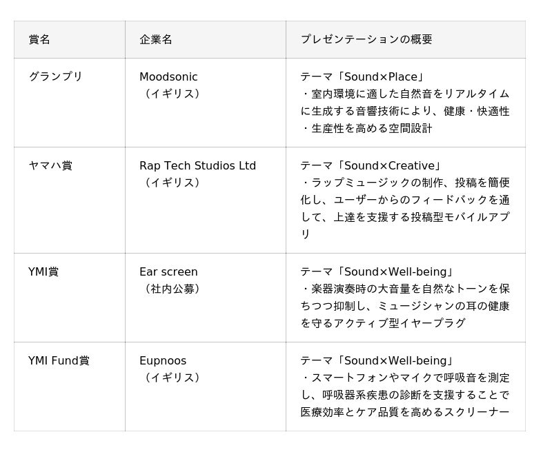 ヤマハ株式会社(以下、当社)は、音を起点とした新たな価値創出を目指す当社初のグローバルビジネスコンテスト「TRANSPOSE Innovation Challenge」(後援:横浜市経済局)のファイナルピッチイベントを2月25日(水)に横浜市で開催し、審査の結果、Moodsonic(本社:イギリス、代表:Evan Benway)がグランプリに選ばれました。Moodsonicには、PoC(概念実証)の実施および事業提携のための費用支援を行ってまいります。そのほか、ヤマハ賞にはRap Tech Studios Ltd(イギリス)、YMI賞には、Ear screen(社内公募)、YMI Fund賞には、Eupnoos(イギリス)が選ばれました。今後、当社とのビジネスの可能性を探るディスカッションなど多様な機会を提供していきます。