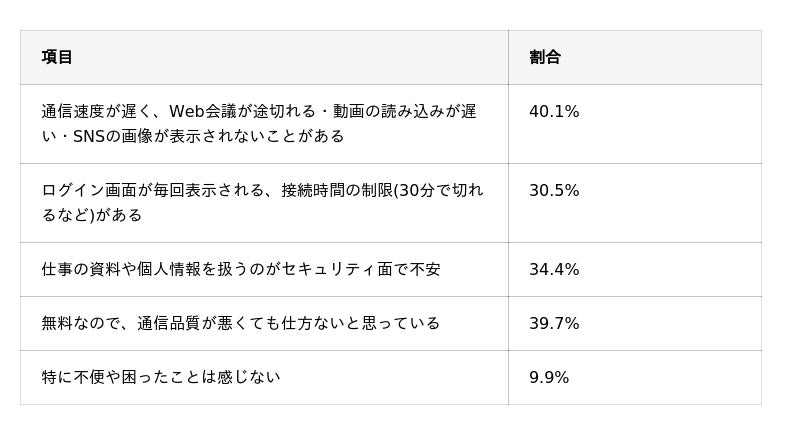 特に「通信速度が遅い」(40.1%)が最多であり、Web会議や動画視聴など一定の通信品質を求める利用シーンにおいては、満足度が十分とは言い難い状況がうかがえます。