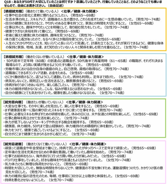 性別で見ると、就労忌避層の女性が67.6%で最も高く、積極就労層の女性が43.7%で最も不安が少なかった。年代別で見ると、就労忌避層の70~74歳が65.1%で最も高く、積極就労層の65~69歳が46.8%で最も不安が少なかった。