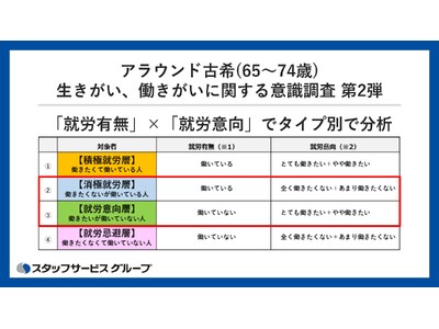 人材総合サービスを全国で展開する株式会社スタッフサービス・ホールディングス(本社:東京都千代田区、代表取締役社長:阪本耕治)は、65~74歳のいわゆる「アラウンド古希」を対象に、「アラウンド古希の生きがい、働きがいに関する意識調査」を実施しました。本調査は、2026年2月12日(木)に発表した第1弾に続く第2弾で、今回は前回の「就労有無」に加えて「就労意向」を掛け合わせた4タイプに分類し、アラウンド古希の価値観や課題を調査しました。