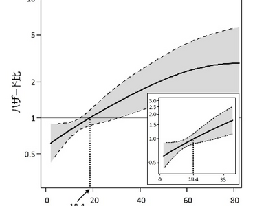 スプライン解析の結果、BNPが基準値上限(18.4 pg/mL)以下であっても、値が低いほど腎機能低下リスクが段階的に低下することが明らかになりました。