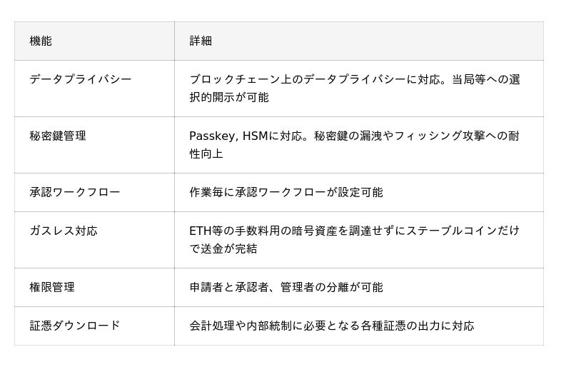 これらの特徴により、企業はステーブルコイン等を活用した送金・決済を、ブロックチェーン上で安心して実行できるようになります。