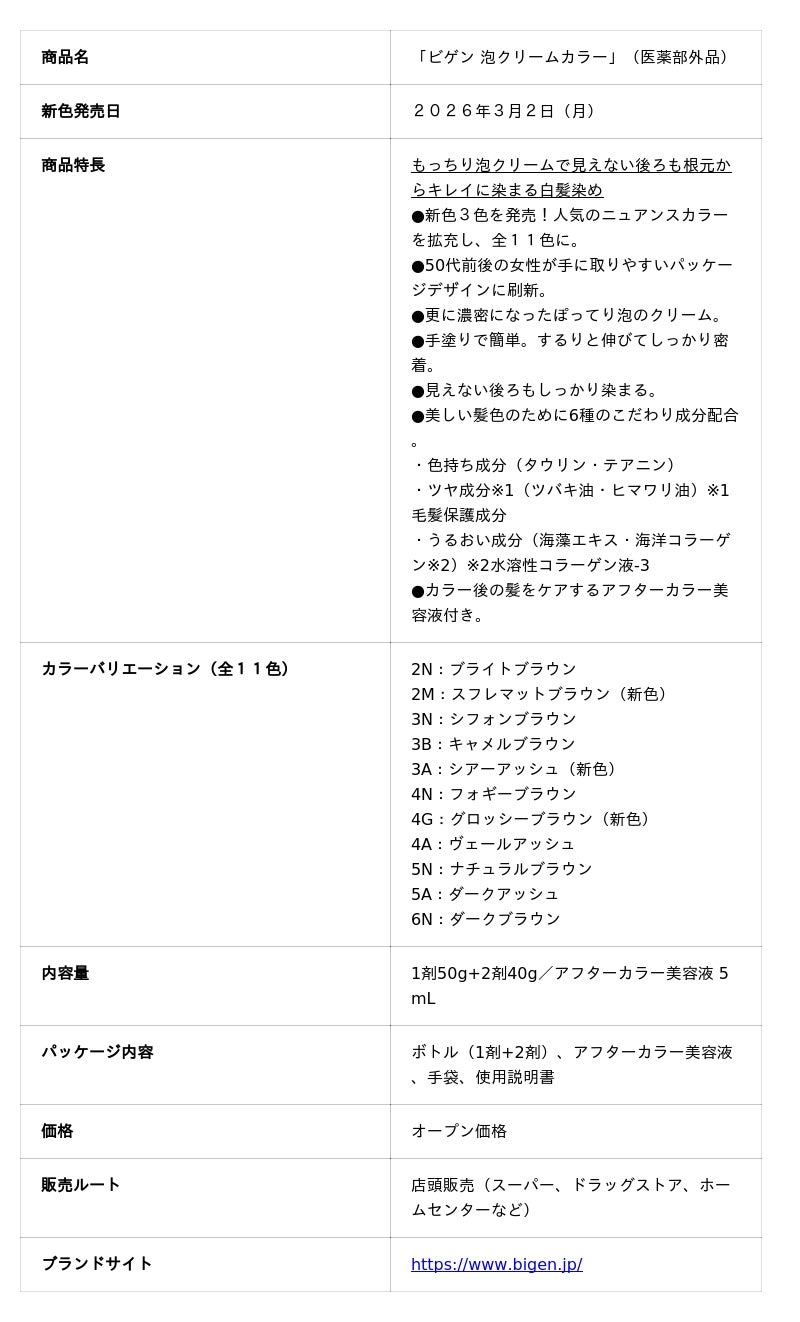 ホーユー株式会社(本社:愛知県名古屋市、代表取締役 社長執行役員:佐々木 義広、以下ホーユー)は、長年白髪用カラーリング市場を牽引してきたブランド「ビゲン」から、見えない後ろも根元からキレイに染まる白髪染め「ビゲン 泡クリームカラー」の新色3色を2026年3月2日(月)より発売いたします。