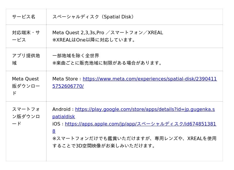 スペーシャルディスクは、3Dライブなどを、Meta Questやスマートフォンで高品質かつ手軽に楽しめる新しい3D空間映像サービスです。