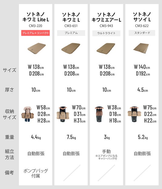 ソトネノキワミ」2019年に発売。しかし、その快適さと引き換えに収納サイズはまさにモンスター級。「もっと手軽に使いたい」というご要望や、物価高騰でキャンプギアの購入をためらってしまう昨今のキャンパーの声にお応えするべく新モデル「ソトネノキワミ Lite」を開発。新しいウレタン構造の採用により収納サイズを約30%削減し、価格を最大11,000円抑えました。