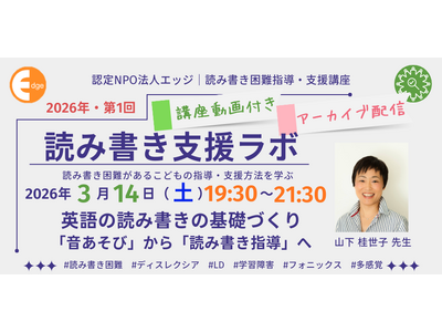 認定NPO法人エッジ(東京都港区)は、2026年3月14日(土)、読み書きに困難をみせるこどもたちのための指導法を学ぶ「読み書き支援ラボ」を開催いたします。講師には英語指導者の山下桂世子先生を迎え、国語の学習過程と同じように、まずは「音」に親しみ、そこからスムーズに「読み書き」へとつなげる段階的なステップを提案します。