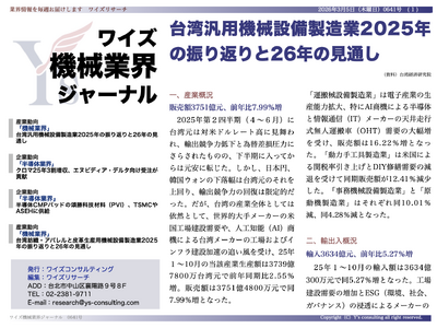 ワイズコンサルティング グループ(本社:中華民国台北市、代表取締役:吉本康志)は台湾機械業界専門誌「ワイズ機械業界ジャーナル」の2026年3月第1週号を発行しました。
