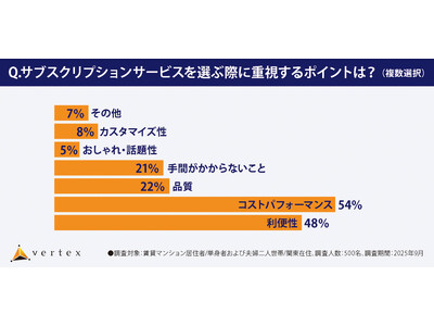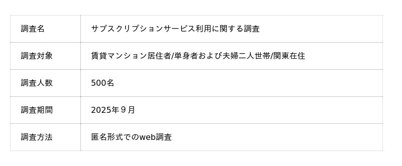 株式会社ベルテックス(所在地:東京都新宿区、代表取締役:梶尾 祐司)は、近年多様な付帯サービス導入で競争が激化する賃貸マンション市場を背景に、おもに首都圏の賃貸マンションに居住する単身者および夫婦二人世帯に対し、サブスクリプションサービスに関する意識調査を実施しました。