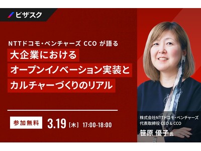 「知見と、挑戦をつなぐ」をミッションにグローバルなナレッジプラットフォームを運営する株式会社ビザスク(以下、当社)は、『大企業におけるオープンイノベーション実装とカルチャーづくりのリアル』をテーマに、株式会社NTTドコモ・ベンチャーズ 代表取締役 CEO & CCO 笹原 優子 氏 ご登壇による無料オンラインセミナーを 3/19 (木) 17:00 より開催します。