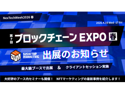 SUSHI TOP MARKETING株式会社(本社:東京都千代田区、代表取締役CEO:徳永大輔、以下 「当社」)は、東京ビックサイトで開催される「 第7回 ブロックチェーン EXPO 春」にて、「最大級ブースでの出展」及び「クライアントセッション(Blockchain Case Studies)登壇」が決定したことをお知らせします。