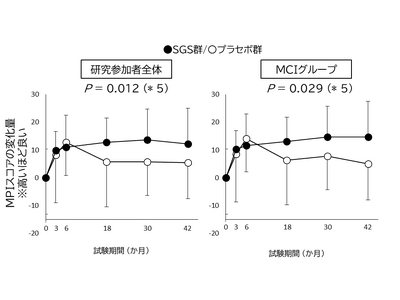 図1. 研究参加者全体およびMCIグループの認知機能指標(MPIスコア)の変化量(●SGS群/〇プラセボ群, 左:試験対象者全体/右:試験開始時にMCIと判定された対象者)