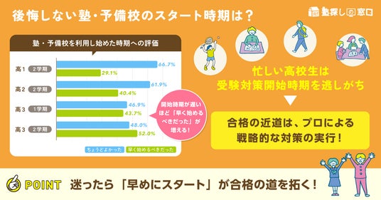 一般入試対策の開始時期は「高校3年生の1学期」に最大のピークを迎え、利用開始時期が遅くなるほど「もっと早く始めるべきだった」との後悔が増加する実態が明らかになりました。