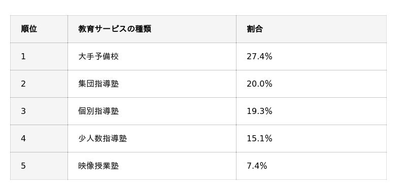 保護者世代が受験生だった頃から馴染み深い駿台や河合塾などの大手予備校が、利用率1位となりました。中学・高校受験からの継続的な利用も想定される、集団指導塾・個別指導塾も支持されています。