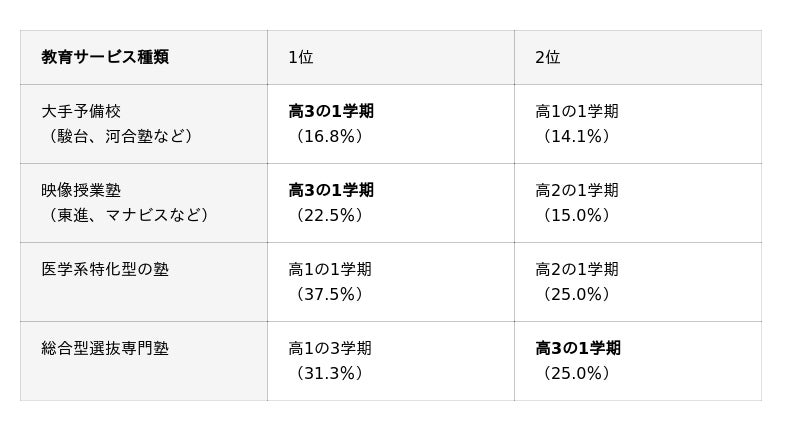 「高1の1学期~高2の1学期」です。医学系特化型の塾や総合型選抜専門塾で、「高3の1学期」を抑え1位になっています。これらの志望系統は準備に時間がかかることを高校生本人も保護者の方も承知しており、早い段階から塾を探しはじめ、受験対策をスタートさせたと考えられます。