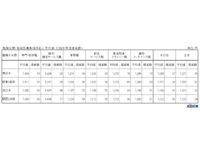 職種大分類別の平均時給は、「専門・技術職」1,282円(前年同月比82円減)、「製造関連・ドライバー職」1,201円(同34円増)、「販売・接客サービス職」1,197円(同86円増)、「事務職」1,197円(同53円増)、「飲食サービス職」1,189円(同52円増)、「清掃・メンテナンス職」1,189円(同51円増)の順で、前年同月比でプラスが5職種、マイナスが1職種となった。