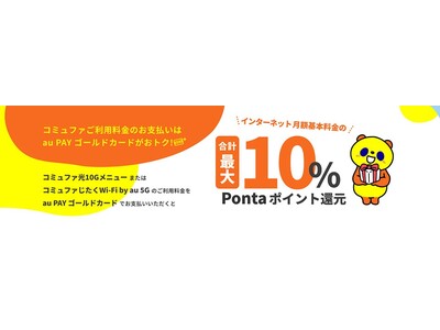 auフィナンシャルサービス(本社:東京都港区、代表取締役社長:長野 敦史)は2026年6月から、中部テレコミュニケーション株式会社(本社:愛知県名古屋市、代表取締役社長:中島 弘豊、略称:ctc)が提供する「コミュファ光10ギガメニュー」または「コミュファじたくWi-Fi by au 5G」(以下、コミュファ対象サービス)のご利用料金支払いに対する特典を開始します。コミュファ対象サービスを au PAY ゴールドカードでお支払いいただくと、合計最大10%のPontaポイントを還元します。本特典の開始により、さらにお得にご自宅でインターネットをご利用いただけます。