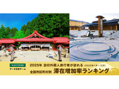 株式会社ナビタイムジャパン(代表取締役社長:大西 啓介、本社:東京都港区)のNAVITIMEデータ分析チームは、訪日外国人観光客向けのナビゲーションアプリ『Japan Travel by NAVITIME』の利用状況から、2025年の1年間を通じて訪日外国人旅行者の滞在が増加している地域の分析結果を発表いたします。