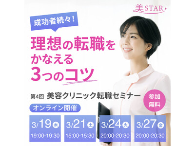 医療従事者のマッチングや医療部材の卸、経営支援等の医療機関のトータルサポート事業を展開する株式会社セントラルメディエンス(本社:東京都港区、代表取締役:中川隆太郎、以下「当社」)は、3月19日・3月21日・3月24日・3月27日の4日間、美容クリニック専門の転職サイト「美STAR」にて転職希望者向けのオンラインセミナーを開催することをお知らせいたします。