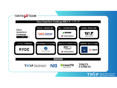 東京都が運営する「多様な主体によるスタートアップ支援展開事業(TOKYO SUTEAM)」において、大企業の新規事業創出支援や大企業とスタートアップ、産・官・学・街との連携で事業創出を目指すオープンイノベーションプラットフォームTokyo Marunouchi Innovation Platform(以下、TMIP)は、株式会社野村総合研究所(以下、野村総合研究所)、グリーンタレントハブ株式会社(以下、グリーンタレントハブ)、トークンエクスプレス株式会社(以下、トークンエクスプレス)と共同での重点分野(環境・エネルギー・気候変動分野)の