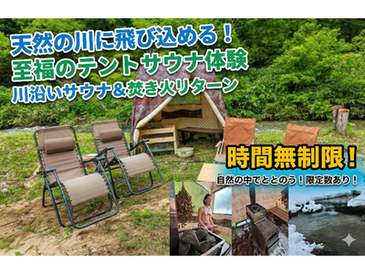 広葉樹豊かな山之村の大自然と清流を満喫できる特別なリターンです。本格薪ストーブのテントサウナで温まった後は、目の前の川へそのまま飛び込めます!川のせせらぎをBGMに、焚き火を眺めながら至福の外気浴を。