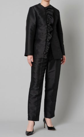 スタイリング/(styling/)のセットアップを使ったハレの日スタイル。ジャケットの縦ラインに沿ったラッフルデザインが程よい甘さを添え、女性らしいエレガントな印象を際立たせます。ブラックを基調としたシンプルな配色ながら、細部にこだわったディテールで特別感を演出し、周囲と差がつくスタイルに。
