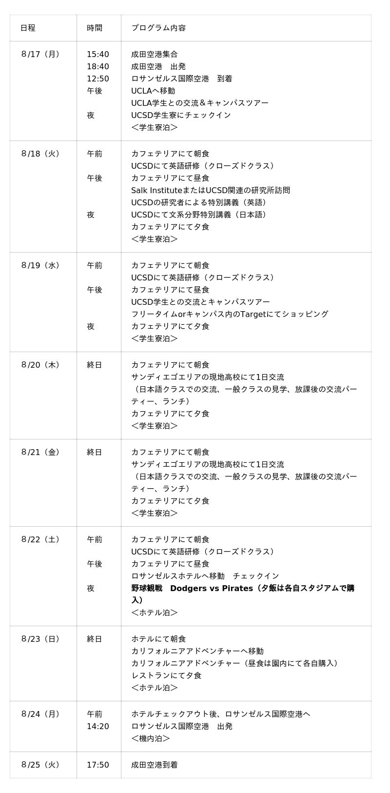 ※天候や現地(大学)の諸事情により日程やアクティビティの内容が変更になる場合がございます。