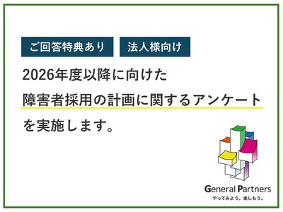 障害者の就労支援を中心にソーシャルビジネスを展開する株式会社ゼネラルパートナーズ(本社:東京都千代田区、代表取締役社長:進藤均)は、「2026年度以降に向けた障害者採用の計画に関するアンケート」を実施いたします。