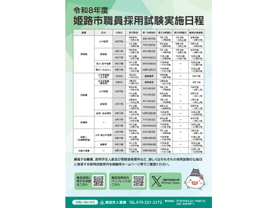 令和8年度の姫路市職員採用試験の実施日程をお知らせします。募集する職種、採用予定人数及び受験資格要件など、詳しくはそれぞれの採用試験の公告日に発表する案内を姫路市ホームページ等でご確認ください。