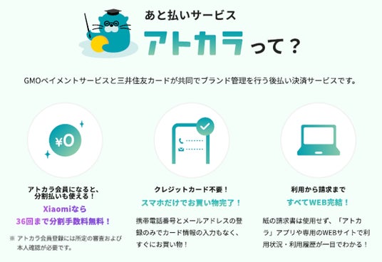 また「アトカラ」は36回までの長期分割払いにも対応しており、Xiaomiオンラインストア「Mi.com」およびXiaomi Storeでは36回払いまで分割払い手数料が無料となります。(※)他にも「利用から請求まで完全WEB完結」を採用していること、および実店舗でもご利用いただけることが「アトカラ」の主な特長です。より幅広いお買い物シーンでのご利用と便利で柔軟なお支払いを実現します。
