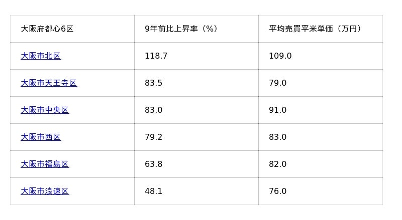 大阪市24区における9年前との上昇率をランキング形式で紹介します。