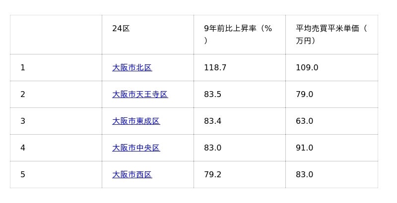大阪市24区価格上昇率ランキング6位以降はすみかうるをご覧ください。