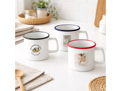 ME-Qなら、レトロでほっこり可愛い“ホーロー風”デザインの陶器マグカップが1個から作成可能!UV-DTFプリント対応で、貼るだけ簡単にオリジナルマグが完成。ノベルティ・記念品にもおすすめです。