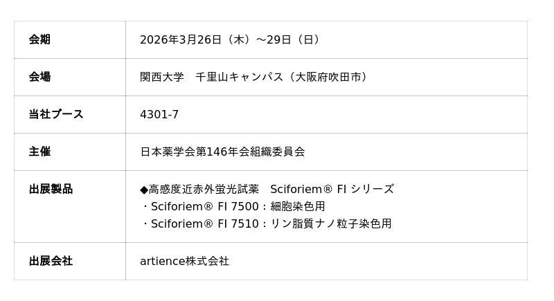 artience株式会社(代表取締役社長 高島 悟、東京都中央区)は、2026年3月26日(木)~29日(日)に関西大学 千里山キャンパス(大阪府吹田市)にて開催される「日本薬学会第146年会(大阪)」に出展します。