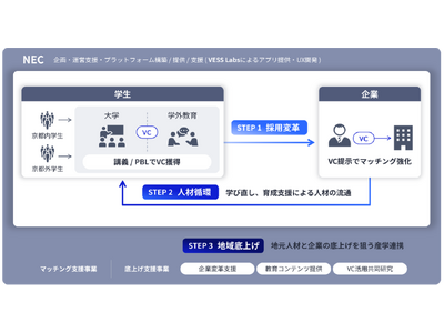 特定非営利活動法人グローカル人材開発センター(注1、以下 グローカル)、株式会社VESS Labs(ベスラボズ、注2)、日本電気株式会社(注3、以下 NEC)は、文部科学省大学間連携共同教育推進事業「産学公連携によるグローカル人材の育成と地域資格制度の開発」 (注4、以下 推進事業連携校)と連携し、分散型ID技術(注5、以下 DID)を活用した「検証可能な資格証明」(注6、以下 VC)を利用し、京都における人材循環モデルを共同で構築します。