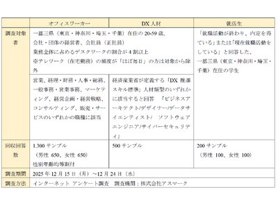本年は、企業のDX人材確保への関心が益々高まっていることから、調査対象者にDX人材を加え、DX人材の求めるオフィス・働き方・街を調査し、一般オフィスワーカーとの比較を行っております。