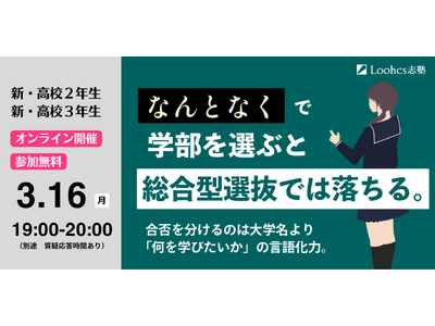 総合型選抜(旧AO入試)専門塾「Loohcs志塾」(運営:Loohcs株式会社、東京都渋谷区)は、2026年3月16日(月)に、新高校2年生・新高校3年生を対象としたオンラインイベント「総合型選抜のための『学部選び』ガイダンス」を開催いたします。