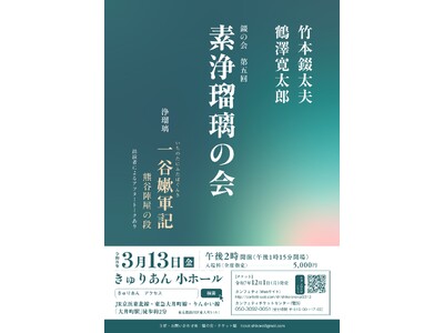 錣の会主催、竹本錣太夫 鶴澤寛太郎 錣の会 第五回 素浄瑠璃の会 浄瑠璃『一谷嫩軍記 熊谷陣屋の段』が令和8年3月13日(金)にきゅりあん小ホール(東京都品川区東大井5-18-1)にて上演されます。
