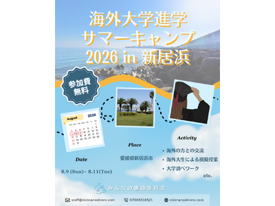特定非営利活動法人みんなの進路委員会は、2026年8月9日(日)から8月11日(火)までの2泊3日、愛媛県新居浜市にて高校生を対象とした「海外大学進学サマーキャンプ2026 in 新居浜」を開催いたします。