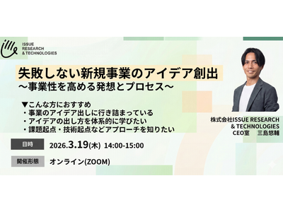 「挑戦者であふれる国にする」をミッションに、新規事業開発や資金調達、M&Aを支援する株式会社ISSUE RESEARCH & TECHNOLOGIES(本社:東京都港区、代表取締役社長:水野)は、ウェビナー【失敗しない新規事業のアイデア創出】を開催いたします。